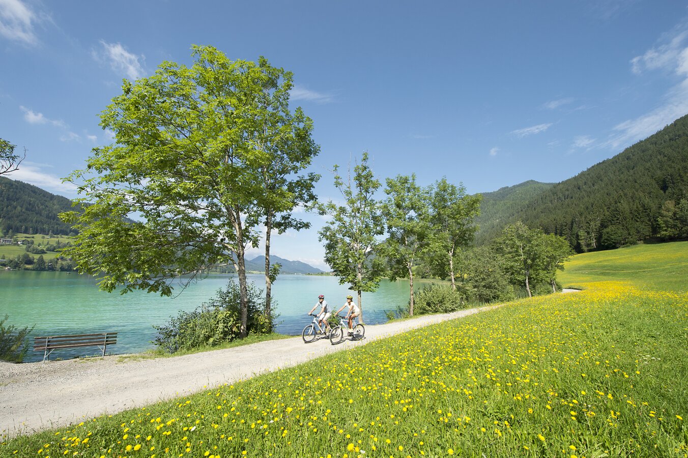 Lake Weissensee is also a rewarding destination for cyclists. Nestled picturesquely in the heart of the Gailtal Alps at an elevation of 930 meters, it is considered the highest alpine bathing lake. Its elongated shape resembles a fjord in places and features a truly enchanting lakeside landscape.